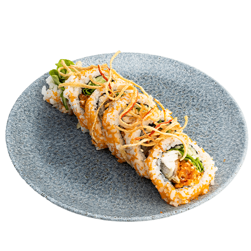 łosoś, tuńczyk, karmazyn w tempurze, surimi, ogórek, serek, awokado, sos teriyaki, sos chilli mayo, chrupki z tempury